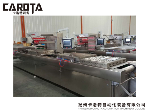 采用連續(xù)步進的方式,由下卷膜成型,上卷膜作為封口,包裝的過程由機器自動完成。根據(jù)需要,裝填可由人工或機械實現(xiàn)。下卷膜由牽引以定距步進,經(jīng)預熱區(qū)和加熱區(qū),由氣壓、真空或沖模成型,在裝填區(qū)填充物料后,進入熱封區(qū)。在熱封區(qū)中,上卷膜經(jīng)導輥后覆蓋在成型盒上。然后進行熱壓封合。熱封合完畢后,可以噴印生產(chǎn)批次及生產(chǎn)日期。經(jīng)橫切、縱切,形成包裝成品。裁切后的邊料可由吸料桶或卷揚裝置收集和清理。